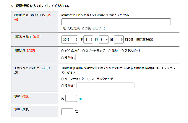 ※「サンゴがいた/いなかった」を報告した場合は、「サンゴマップ:サンゴの分布情報マップ」にも反映されます。